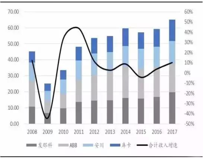 受益于全球自動化率提升(尤其是3C產(chǎn)品)以及新興國家勞動力成本上升帶來強勁市場需求,2017年四大家族業(yè)績表現(xiàn)搶眼。從營收看,除ABB受近期業(yè)務整合影響下降外,其余三家均保持上升趨勢,從凈利潤上看,四大家族均有不同程度上漲。